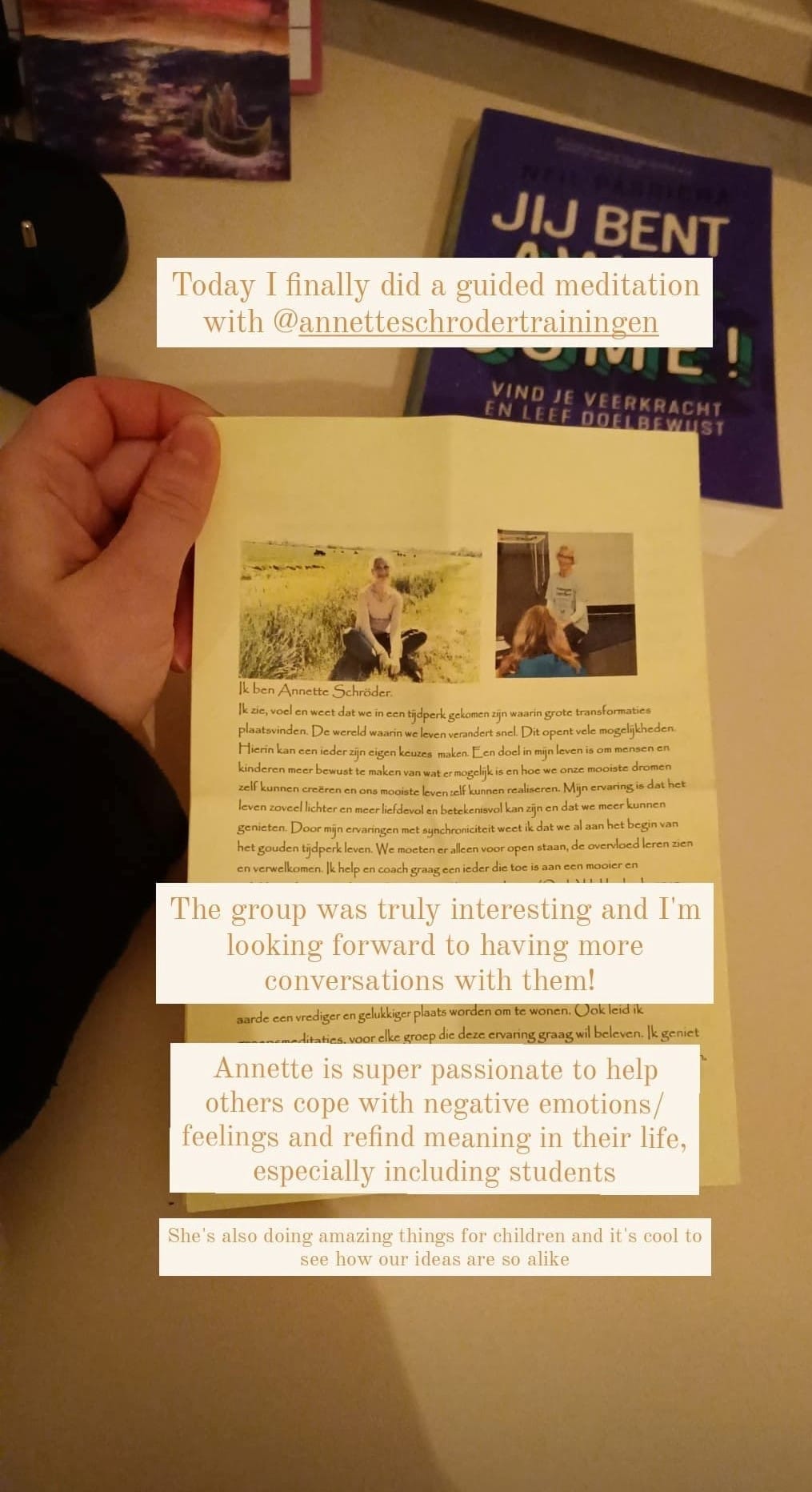Ik vond de lessen heel erg leuk en fijn om te doen. Altijd als ik na de les naar huis fietste was ik helemaal mindful en rustig. En ook in de klas probeerde ik me af te sluiten voor de drukte door een korte ademoefening te doen. Dat hielp, en ik voelde me daarna veel beter. Toen de lessen waren afgelopen vond ik dat jammer en wist ik niet zo goed hoe ik toen verder moest. Ik heb nog eens in de map gekeken en ik zag dat er een paar oefeningen bij stonden die je ook in je bed kan doen. Sindsdien ben ik bijna elke avond bezig met oefeningen. Het was in het begin even inkomen maar ik pak het volgens mij vrij snel weer op. Kortom, het was leuk, rustgevend en fijn om die lessen te krijgen.